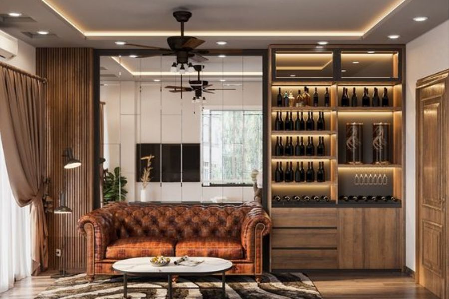 Phòng khách là nơi được ưu tiên hàng đầu để sử dụng làm nơi đặt tủ rượu. Trang trí tủ rượu phòng khách đẹp với mục đích trưng bày những chai rượu quý của gia chủ.