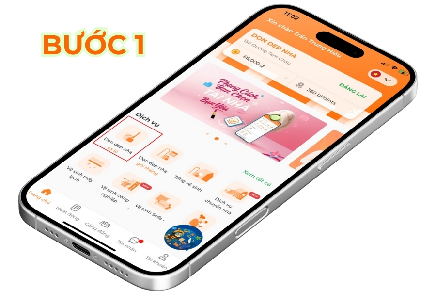 - Mở app bTaskee và chọn “Dọn dẹp nhà” (thời gian: 30 giây) – Nhấn vào biểu tượng màu cam ngay tại màn hình chính