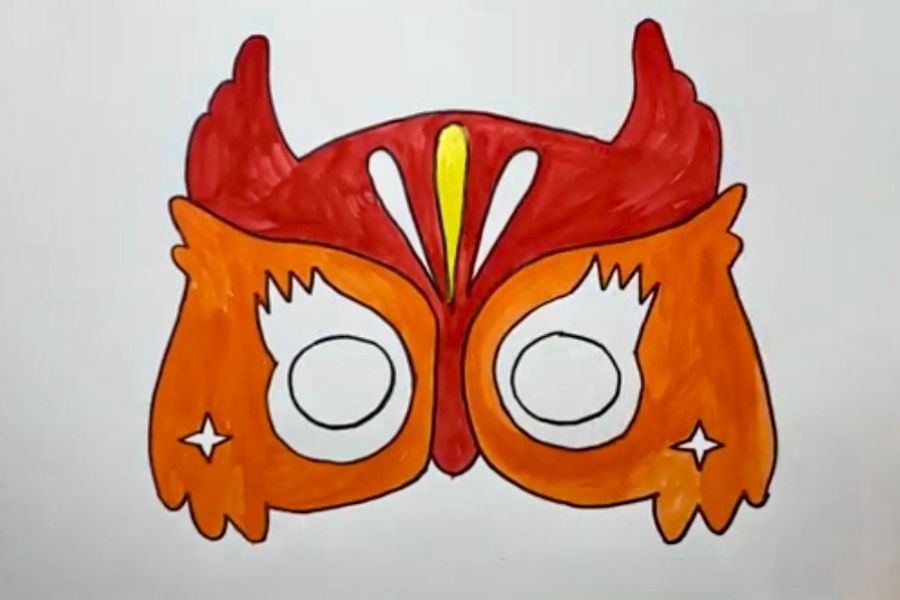 - Bước 4: Dùng các màu sắc tươi sáng và vẽ thêm các họa tiết như sao, trăng để tạo nên một chiếc mặt nạ cú thật độc đáo.