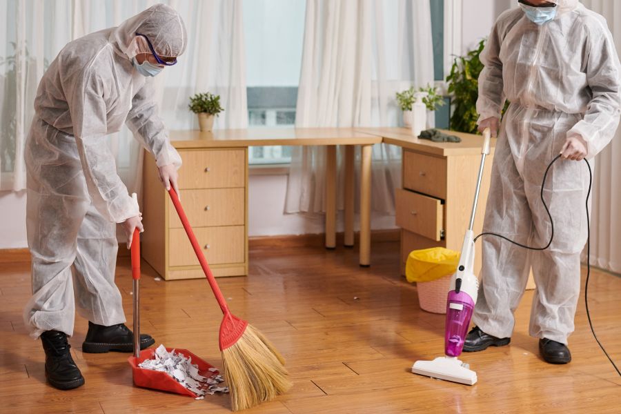 - Làm sạch sàn nhà, hành lang, lối đi chung.