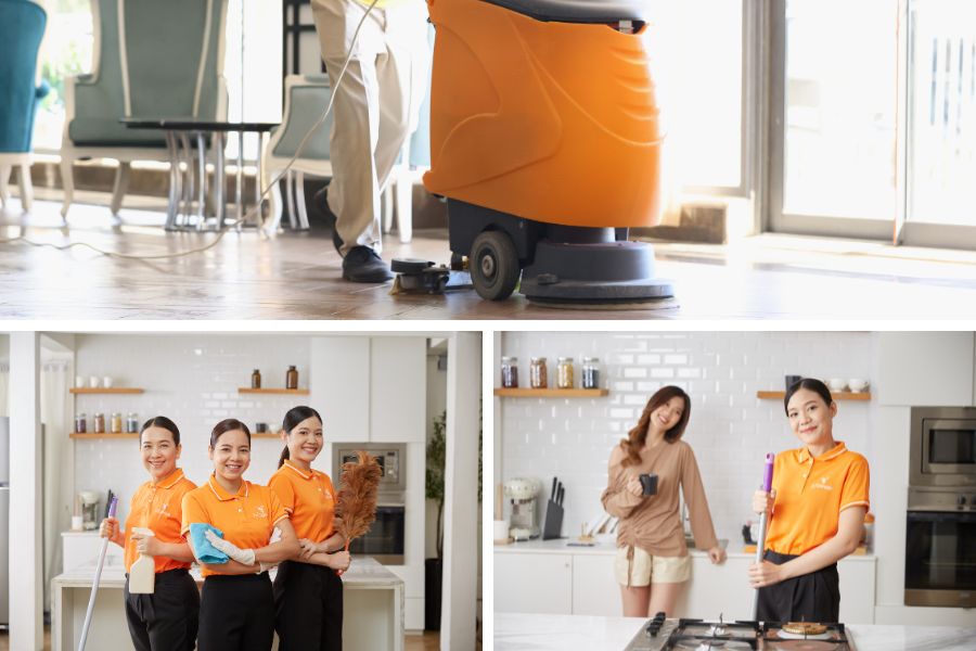 | Trường hợp sử dụng | Sau xây dựng, cải tạo, cần làm sạch kỹ các vết bẩn công nghiệp. | – Khi cần vệ sinh tổng thể định kỳ hoặc làm sạch sâu từng khu vực.- Vệ sinh trước khi chuyển nhà, dịp lễ tết… | Cần làm các công việc nhà cơ bản hàng ngày như lau dọn, rửa chén, nấu ăn. |