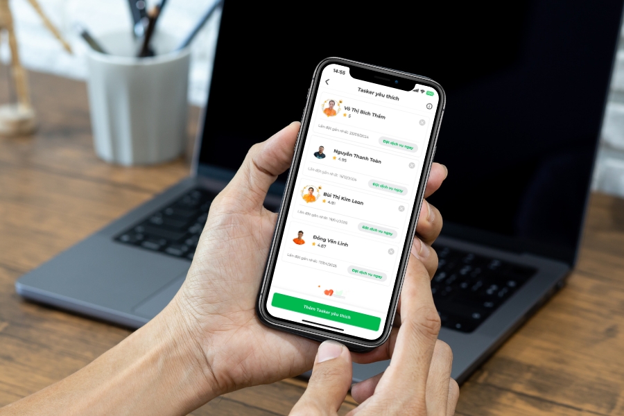 Thông tin Tasker minh bạch trên ứng dụng gồm tên, ảnh, đánh giá sao, số công việc đã hoàn thành và phản hồi khách hàng, giúp bạn dễ dàng chọn lựa và yên tâm khi sử dụng dịch vụ.