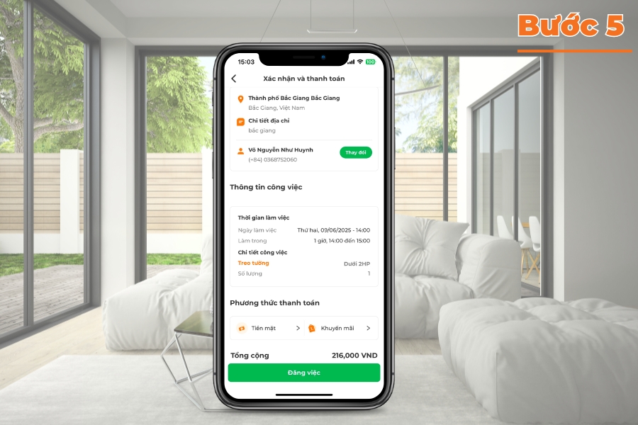 - Kiểm tra lại thông tin đặt dịch vụ, chọn hình thức thanh toán và xác nhận đơn hàng.