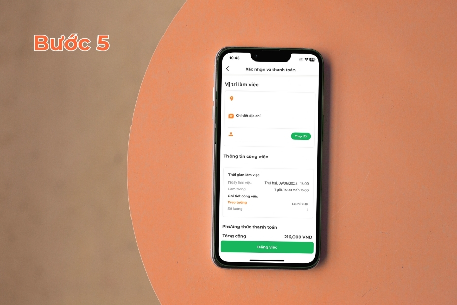 Kiểm tra lại thông tin đơn hàng, chọn hình thức thanh toán và xác nhận đặt lịch. Sau khi đặt thành công, bạn có thể theo dõi tiến độ, xem thông tin Tasker và liên hệ trực tiếp qua ứng dụng.
