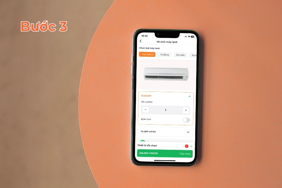 Tiếp theo, chọn công suất máy (dưới 2HP, từ 2HP trở lên, dưới 3HP, trên 3HP, dưới 5HP, trên 5HP) tương ứng với máy điều hòa cần vệ sinh.