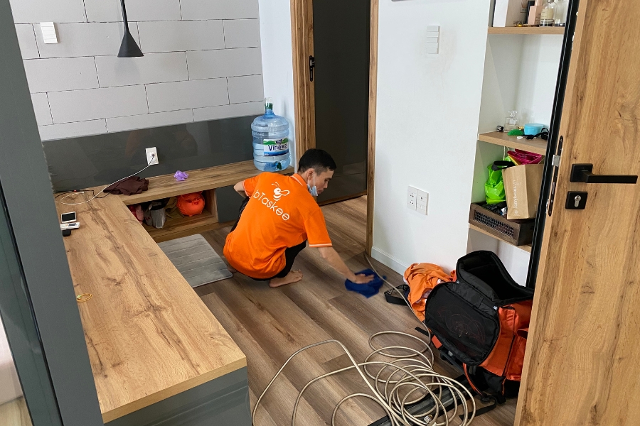 Bước cuối cùng, Tasker dọn dẹp sạch sẽ khu vực làm việc, lau khô nước và trả lại hiện trạng ban đầu cho không gian. Mọi dụng cụ và vật tư thừa đều được thu gom gọn gàng.