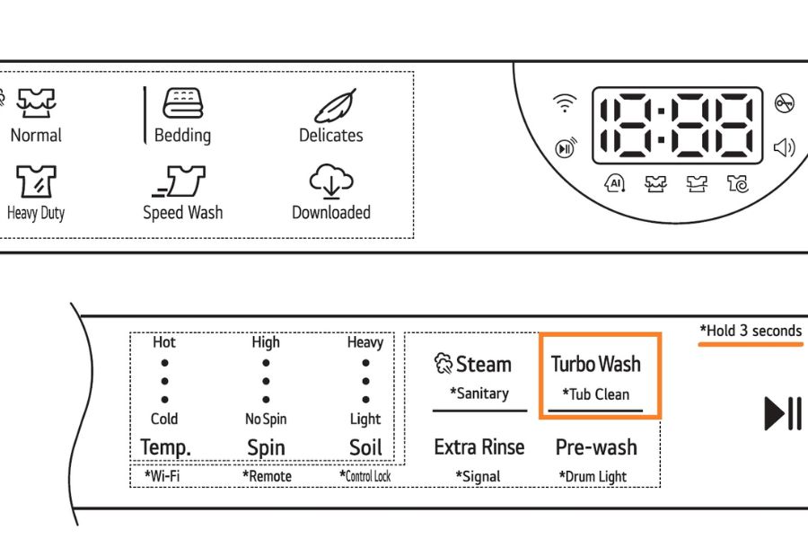 - Bước 1: Đảm bảo đã lấy hết quần áo ra ngoài. Bạn mở nguồn trên máy giặt. Sau đó trên thanh điều khiển, bạn tìm chức năng vệ sinh lồng giặt (Tub Clean). Mỗi hãng máy giặt khác nhau thì tên chức năng này cũng sẽ khác.