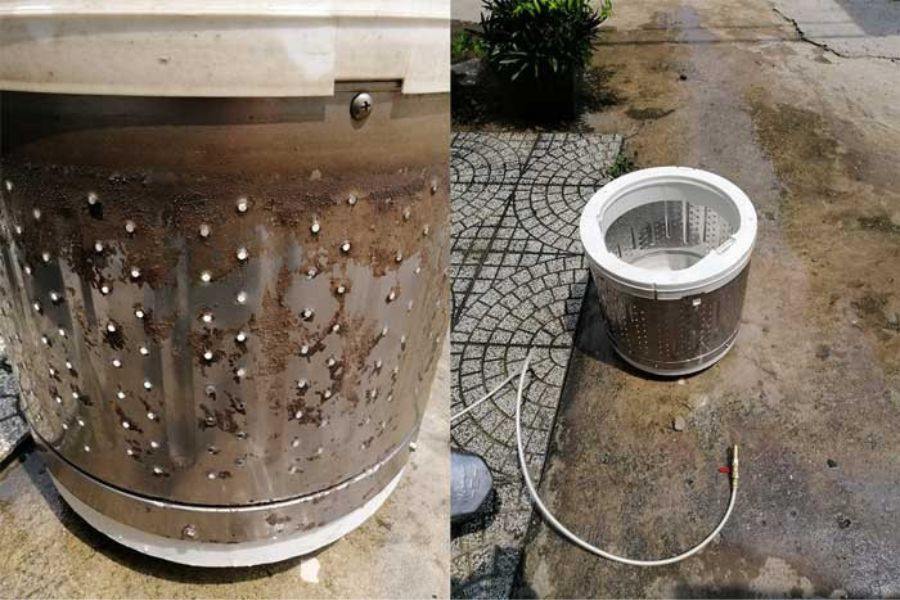 - Bước 4: Dùng vòi xịt để rửa bên trong và bên ngoài lồng giặt và mâm giặt. Sau đó dùng bàn chải cọ hết các bụi bẩn và mảng bám còn sót lại.