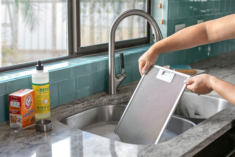 Đổ đầy nước nóng, nước rửa bát và baking soda vào chậu rửa và ngâm lưới lọc trong 15 đến 20 phút. Sau đó sử dụng bàn chải làm sạch chà sạch dầu mỡ và bụi bẩn bám trên lưới lọc máy hút mùi.