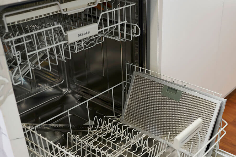 Máy rửa chén được thiết kế để có thể loại bỏ được những vết bẩn dầu mỡ cứng đầu nhất nên bạn hoàn toàn có thể dùng nó để vệ sinh lưới lọc máy hút mùi.