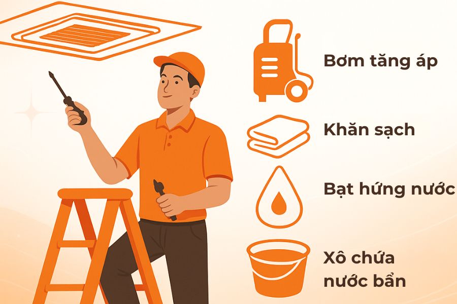 Hình ảnh: Bộ dụng cụ vệ sinh máy lạnh âm trần được sắp xếp gọn gàng với thang chữ A, bơm tăng áp và các thiết bị bảo hộ
