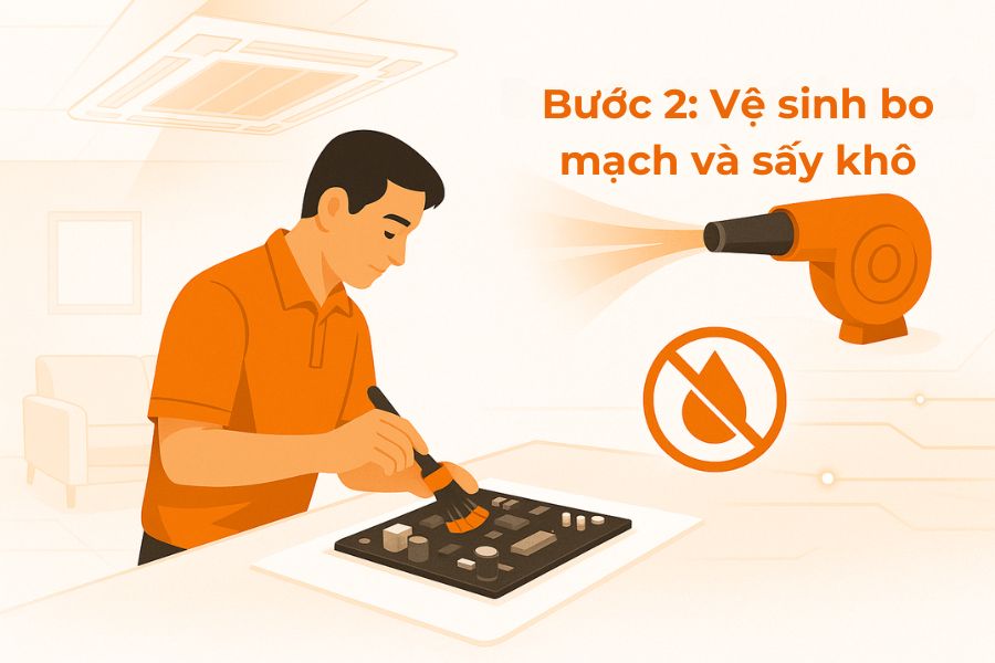 - Bảo vệ bo mạch: Dùng băng dính cách điện che chắn kín tất cả bo mạch điện tử, tránh nước và hơi ẩm.