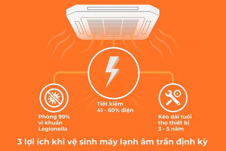 3 lý do khoa học bắt buộc phải vệ sinh máy âm trần: Tiết kiệm 41-60% điện năng (NADCA 2025), phòng ngừa 99% vi khuẩn Legionella và kéo dài tuổi thọ thiết bị 3 – 5 năm.