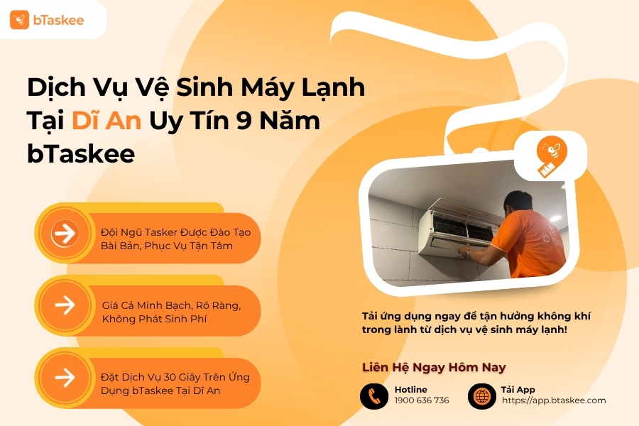Với 9 năm kinh nghiệm, đội ngũ Tasker địa phương chuyên nghiệp, quy trình chuẩn hóa và chính sách bảo hành 7 ngày, bTaskee cam kết mang đến cho mọi gia đình tại Dĩ An không gian sống trong lành, máy lạnh hoạt động hiệu quả và sự yên tâm tuyệt đối.
