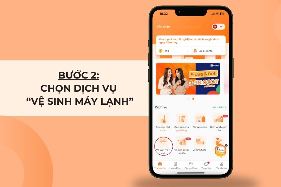 Trên giao diện chính, chọn “Vệ sinh máy lạnh” từ danh sách dịch vụ.
