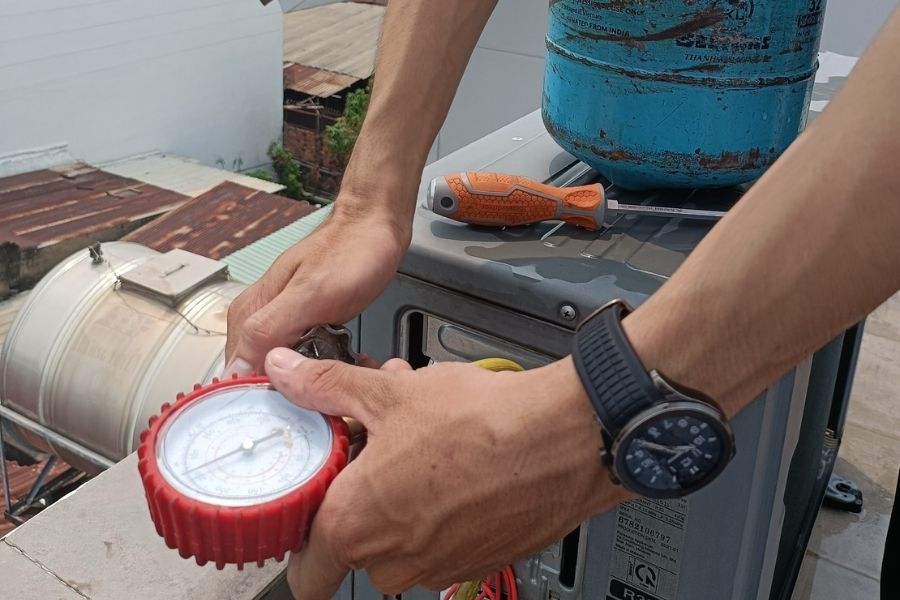 Bước 7: Nếu có nhu cầu, kỹ thuật viên sẽ hỗ trợ bơm gas tối đa 30 PSI/lần. Trường hợp cần nạp thêm, khách hàng sẽ được thông báo và báo giá trước để đảm bảo minh bạch.