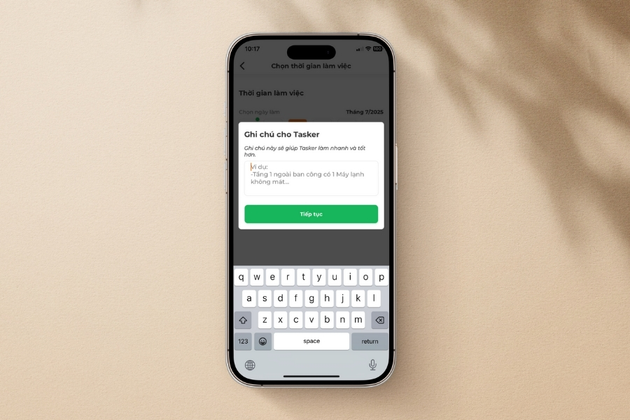 Bước 4: Nhập ngày và giờ sử dụng dịch vụ. Nếu có yêu cầu hoặc lưu ý đặc biệt, khách hàng có thể ghi chú cho Tasker ở bước này
