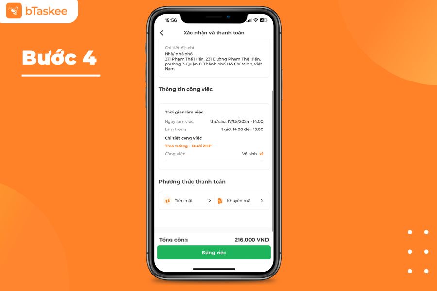 Sau khi hoàn tất, quý khách sẽ nhận được thông báo xác nhận đặt lịch thành công cùng thông tin Tasker sẽ đến nhà. Khi dịch vụ hoàn thành, hãy đánh giá chất lượng trên ứng dụng để giúp bTaskee cải thiện trải nghiệm.