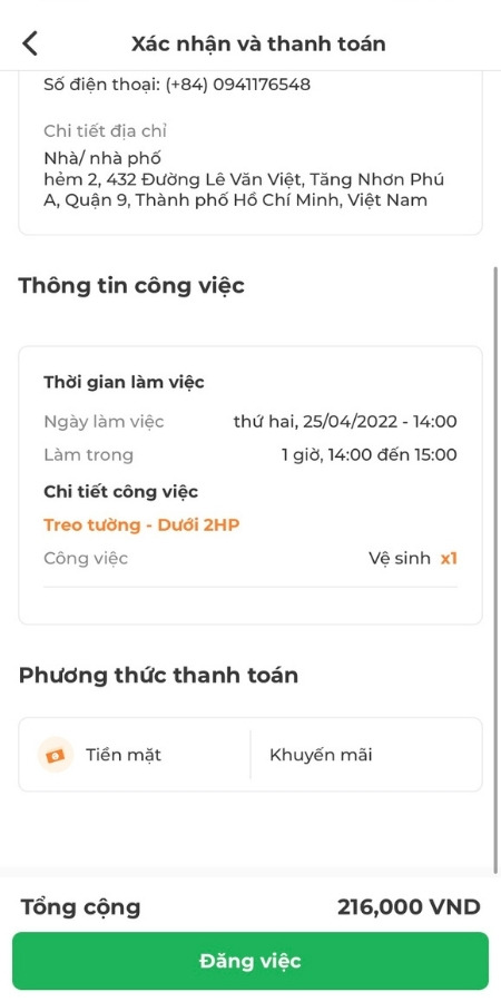 Sau khi hoàn tất đặt lịch, hệ thống sẽ gửi thông báo xác nhận và thông tin của Tasker sẽ được cập nhật trước thời gian thực hiện dịch vụ.