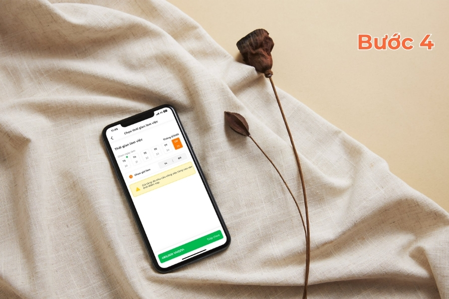 Chọn ngày và khung giờ phù hợp. Ứng dụng hiển thị các khung giờ còn trống để bạn lựa chọn. Nên đặt trước ít nhất 2 tiếng để có nhiều tasker sẵn sàng nhận việc.