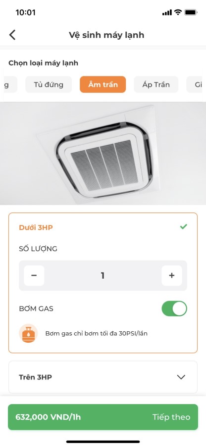 Nhập số lượng máy cần vệ sinh và lựa chọn dịch vụ bơm gas kèm theo nếu cần. Hệ thống tự động tính toán tổng chi phí và hiển thị thời gian dự kiến hoàn thành công việc.