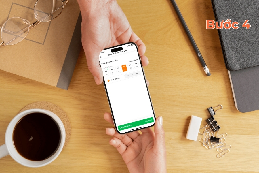 Hệ thống gợi ý các khung giờ có sẵn và Tasker gần nhất để tối ưu thời gian chờ đợi. Có thể đặt lịch trước 1-7 ngày hoặc đặt lịch khẩn cấp trong ngày với phụ phí hợp lý.