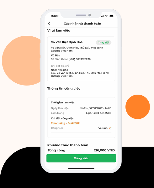 Bước 5: Kiểm tra lại các thông tin: số điện thoại, địa chỉ, phương thức thanh toán rồi tiến hành nhấn “Đăng việc”