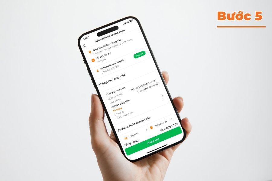 Xem lại toàn bộ thông tin đã nhập: địa chỉ, loại máy, thời gian và giá cước. Thêm ghi chú đặc biệt nếu cần. Sau khi xác nhận, hệ thống sẽ tự động tìm tasker phù hợp và thông báo thông tin chi tiết.