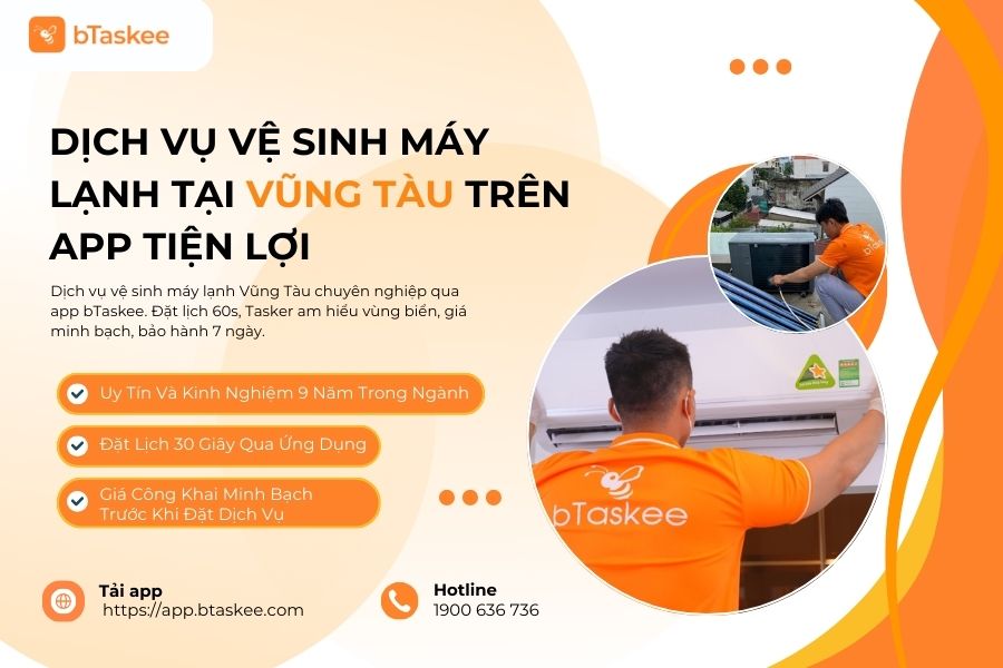 bTaskee mang đến dịch vụ vệ sinh máy lạnh chuyên nghiệp với 5 ưu điểm vượt trội: kinh nghiệm 9 năm phục vụ triệu khách hàng, ứng dụng đặt lịch nhanh 60 giây, đội ngũ tasker am hiểu đặc thù vùng biển, giá cả minh bạch ngay từ bước đầu và phạm vi phục vụ toàn bộ 16 phường thuộc thành phố Vũng Tàu.