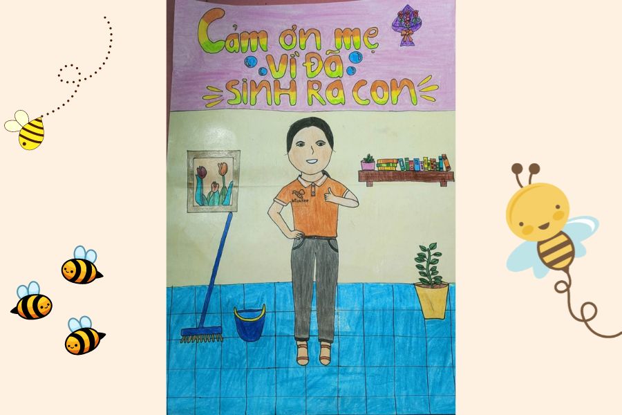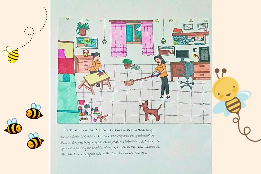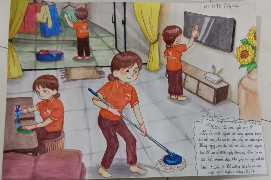 Workshop “Vẽ điều con chưa nói” được bTaskee tổ chức vào dịp 20/10/2023 nhằm mục đích lan tỏa một chút cảm xúc, một chút động lực phấn đấu cho Cộng đồng Tasker. Những bức tranh được chính tay các em “Ong nhí” vẽ về mẹ của mình, thể hiện tình cảm và nỗi thấu hiểu dành cho công việc của mẹ.