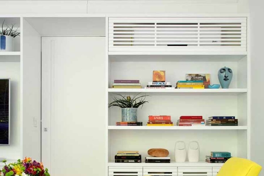 Nếu trong phòng ngủ máy lạnh của bạn có kệ sách thì lắp đặt máy lạnh ở vị trí bên trên kệ sách là một ý tưởng không tồi chút nào. Máy lạnh sẽ được “giấu kín” nếu chúng được lắp đặt bên trên kệ sách.