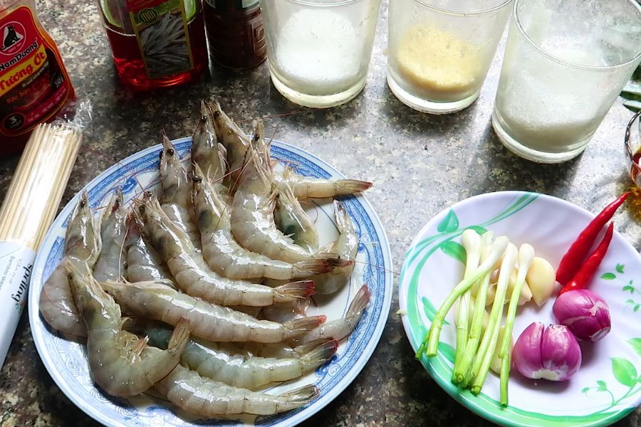 - Bước 1: Chọn tôm sú tươi, rửa tôm sau đó ướp tôm với gia vị đã chuẩn bị gồm nước mắm, nước lọc, nước cốt chanh, đường, mật ong, hạt tiêu cùng với sả, ớt băm nhuyễn để trong khoảng 40 đến 50 phút.