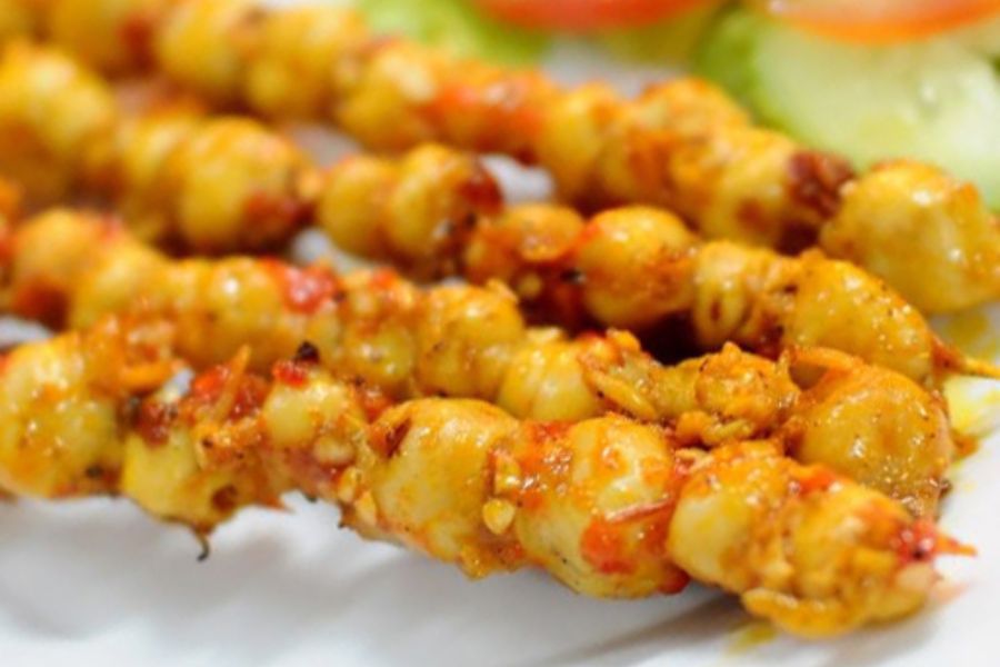 Nếu bạn là tín đồ của món hải sản nướng thì không thể bỏ qua được xiên mực nướng sa tế. Những miếng mực thơm ngon và vị cay nồng của sa tế khiến bạn khó mà chối từ.
