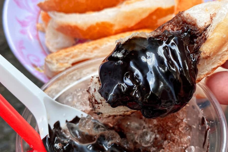 - Bào đá ra ly rồi đổ hợp trên vào. Dùng muỗng dầm nhẹ rồi chấm vào bánh mì là ngon khó cưỡng.