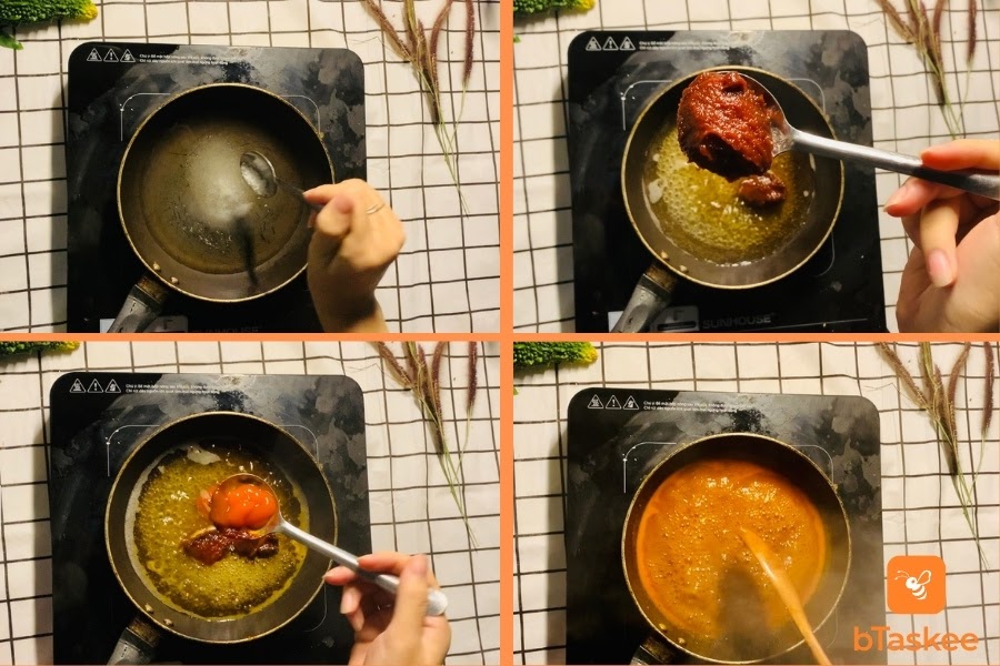 Bắc chảo lên bếp cho vào chảo nửa chén nước lọc, 1 muỗng đường,1/2 muỗng nước mắm, 1/2 muỗng bột ngọt, 1/4 muỗng muối, 1 muỗng xì dầu, 1 muỗng ớt bột, 2 muỗng tương ớt chin-su và 2 muỗng tương ớt Hàn Quốc.