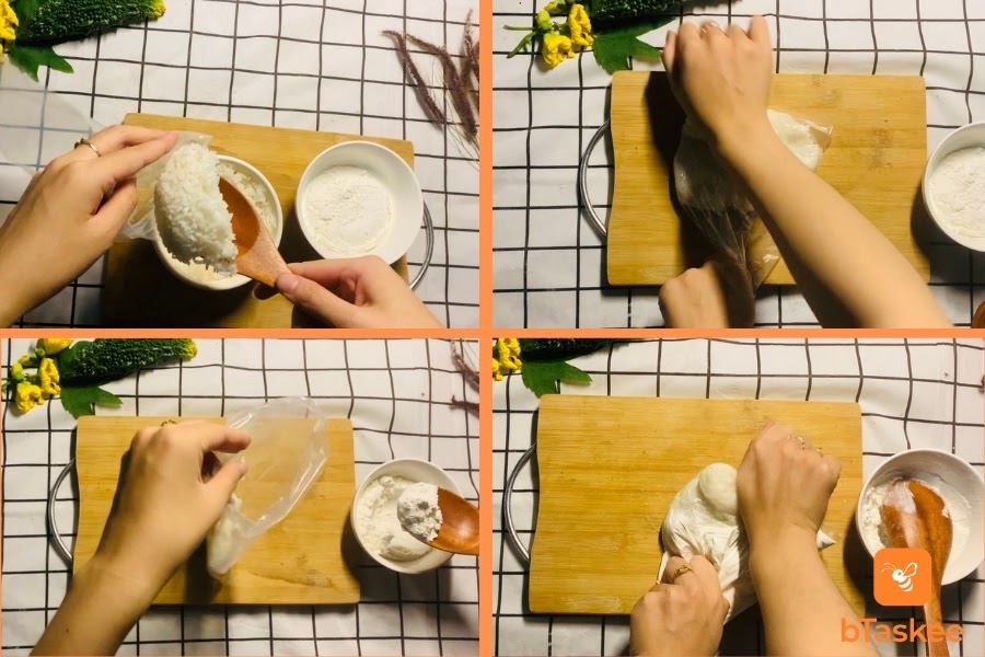 Trộn bột năng vào cơm nguội rồi nhào lại khoảng 3 phút. Đến khi tạo thành 1 khối bột thống nhất.