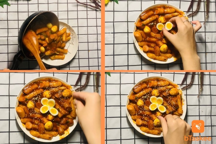 Múc bánh ra tô và rắc thêm mè rang và trứng. Bánh gạo nên được ăn khi còn nóng, sợi bánh gạo dai dai hòa cùng phần nước sốt hơi cay và chuẩn vị Hàn Quốc.