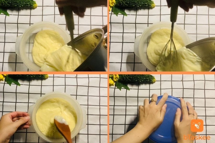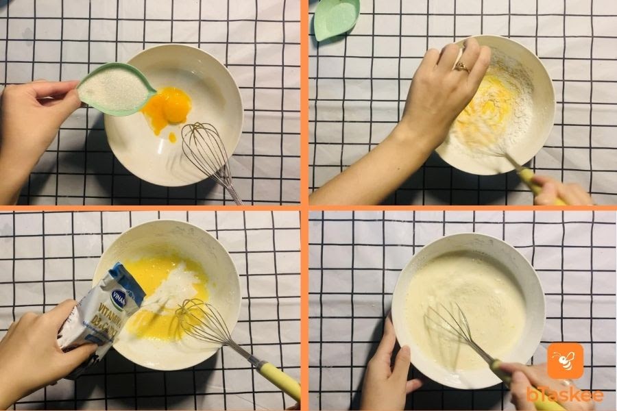 Đánh tan đường và 2 lòng đỏ trứng gà. Kế tiếp cho 30g bột bắp vào trộn đều. Cuối cùng, cho 440ml sữa tươi không đường vào, khuấy đều đềi và lọc hỗn hợp qua rây.