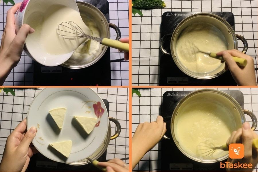 Bắc hỗn hợp lên bếp khuấy với lửa nhỏ đến khi hỗn hợp gần chín thì cho 3 miếng phô mai vào, tiếp tục khuấy đến khi hỗn hợp chín.