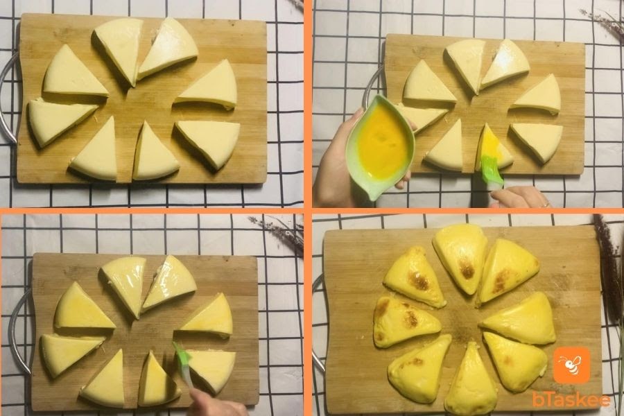 Lấy bánh ra khỏi khuôn, cắt thành miếng đều nhau. Sau đó dùng 1 lòng đỏ trứng gà quét lên mặt bánh rồi đem nướng ở nhiệt độ 170 (độ C) trong 20 phút.