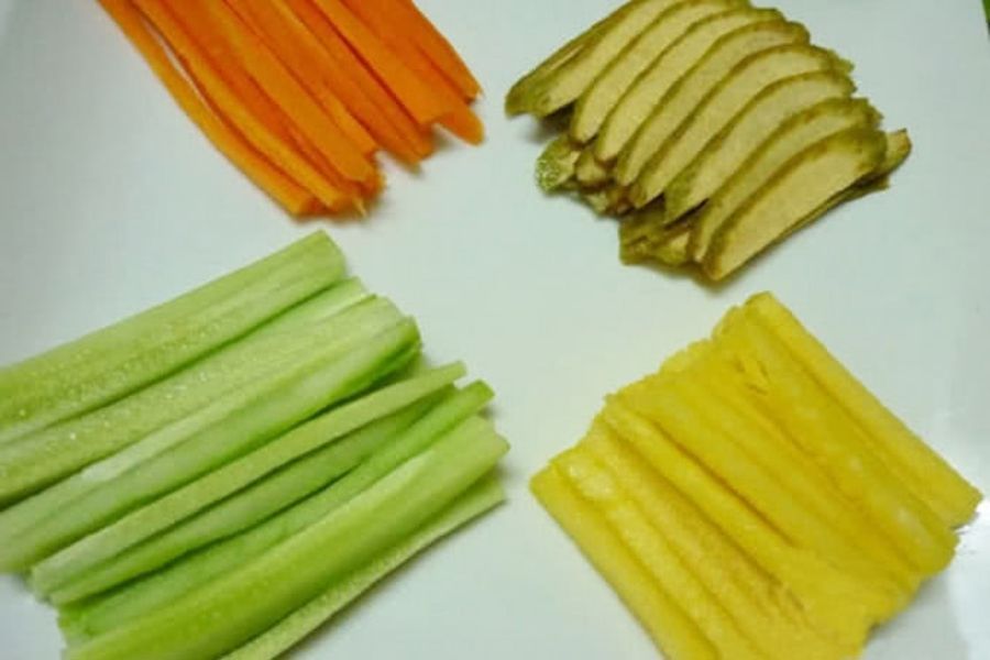 - Dưa chuột rửa sạch, gọt vỏ, thái hình que. Cà rốt rửa sạch, bỏ vỏ thái nhỏ như dưa chuột. Xếp tất cả vào cùng một đĩa riêng.