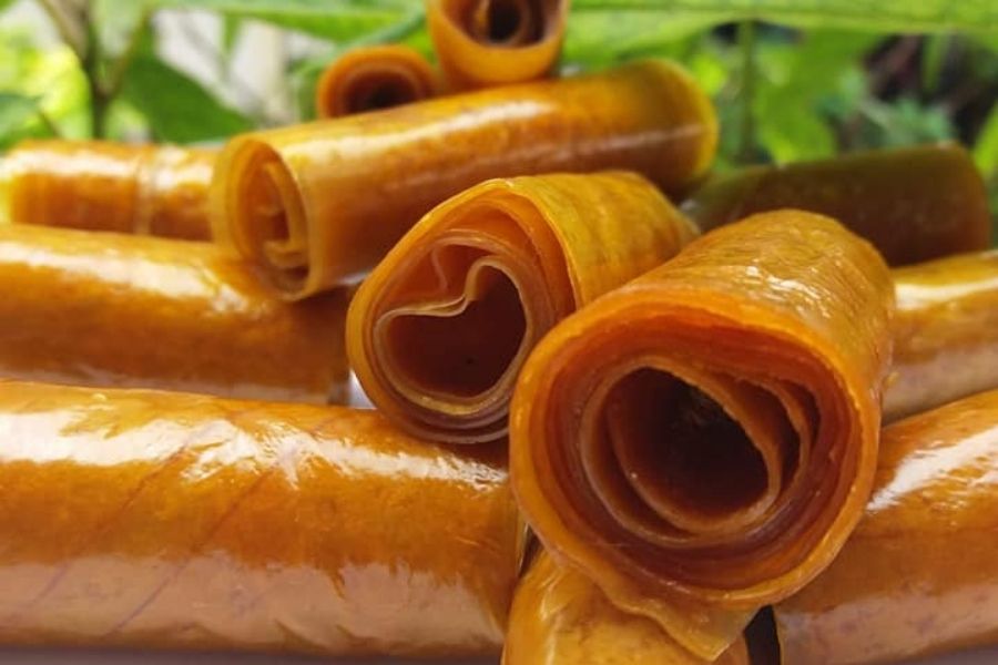 Dùng kéo cắt dài bánh tráng xoài rồi cuộn chúng lại thành từng cuộn. Món bánh tráng xoài Nha Trang thành phẩm, sẽ có màu vàng nâu rất đẹp mắt. Bánh tráng dai, dẻo có vị ngọt và chua nhẹ. Chắc chắn sẽ là món ăn gây nghiện cho cả nhà đấy.