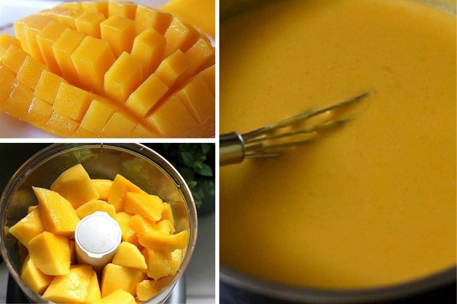 Xoài chín mua về rửa sạch, nạo lấy phần thịt xoài bên trong, cắt thành miếng nhỏ vừa ăn. Cho xoài và một ít nước cốt chanh vào máy sinh tố để xay nhuyễn, tạo thành hỗn hợp xoài màu vàng hơi sệt.