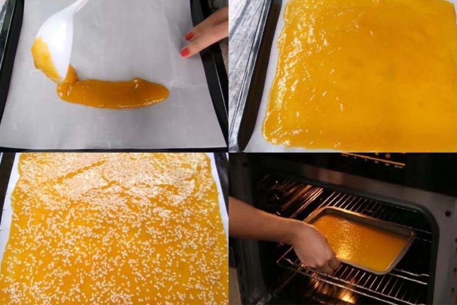 Dùng giấy nến lót lên bề mặt khay đã chuẩn bị. Dùng cọ quét đều hỗn hợp lên giấy nến. Sau đó bỏ khay vào lò nướng 5-6 tiếng, để bánh khô lại. Chú ý quét lớp mỏng vừa phải, cách làm bánh tráng xoài như này, sẽ giúp chúng mau khô, không bị quá dai.