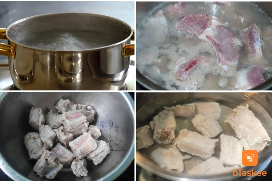 - Bắc một nồi nước lên bếp, cho 1 thìa cà phê muối vào. Nước sôi, bỏ sườn vào chần đến khi nước sôi bùng lại thì tắt bếp.
