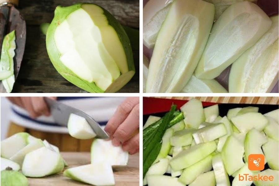 - Đu đủ xanh gọt vỏ bỏ ruột, rửa sạch với nước. Sau đó, cắt đu đủ thành miếng vừa ăn.