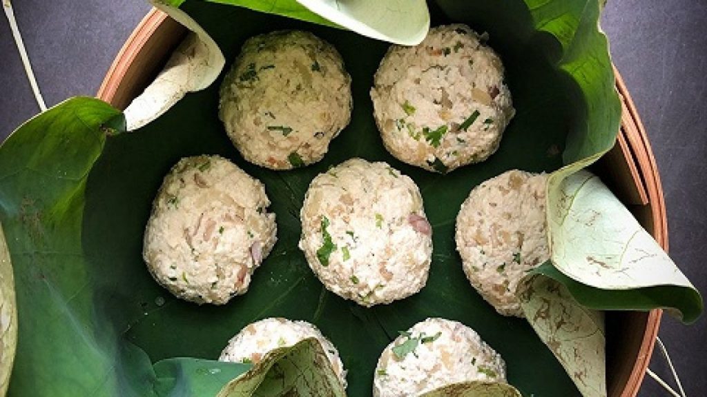 - Dùng lá sen hoặc lá chuối để lót, giúp miếng chả sau khi hấp có mùi thơm đặc trưng.