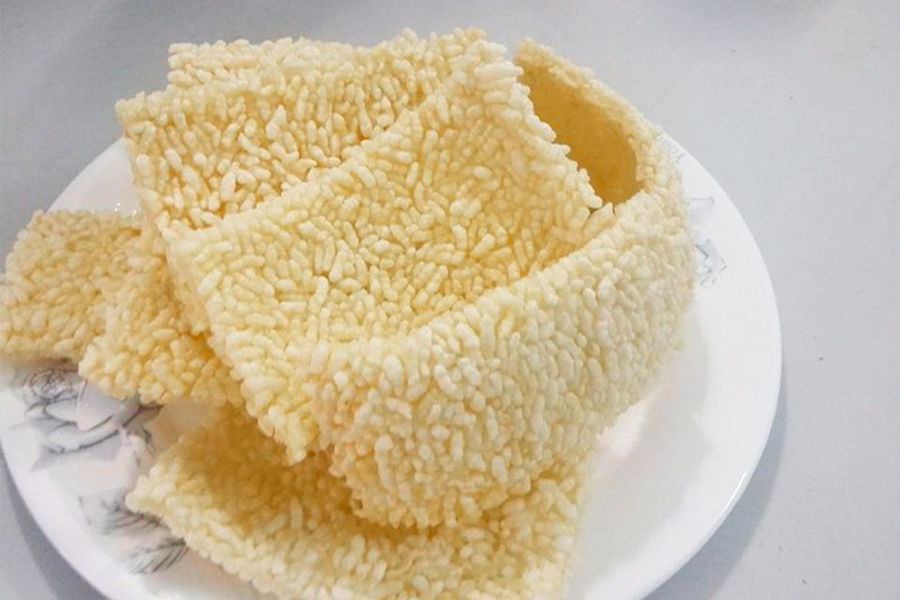 Cơm cháy chiên đến khi nổi phồng lên, chuyển sang màu vàng thì nhanh chóng vớt ra. Cho chúng vào giấy thấm dầu, để loại bỏ phần dầu dư.