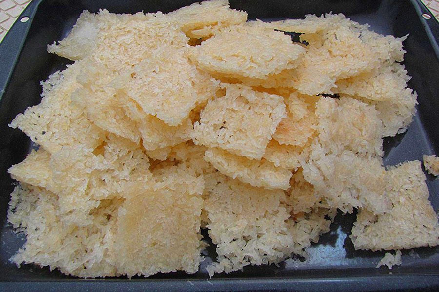 Để cơm cháy được giòn đểu và phồng hơn khi chiên, chúng ta nên phơi nắng cho cơm khô lại. Nấu không khi chiên, cơm sẽ không nở phồng được, bị chay cứng lại, sẽ không còn ngon nữa