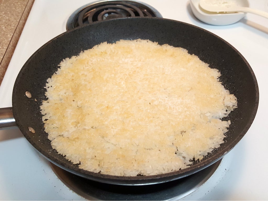 Cơm sau khi được ép trên chảo, để lửa nhỏ, đến khi cơm cháy sém cạnh thì tắt bếp nhé.